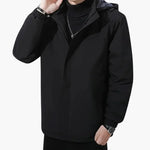 This men's jacket features a stand-up collar with an integrated hood, closed by a full front zipper. The interior has a full lining that retains heat. The long sleeves end with elastic cuffs, while the side pockets add a practical touch. A straight hem completes the plain outer design.