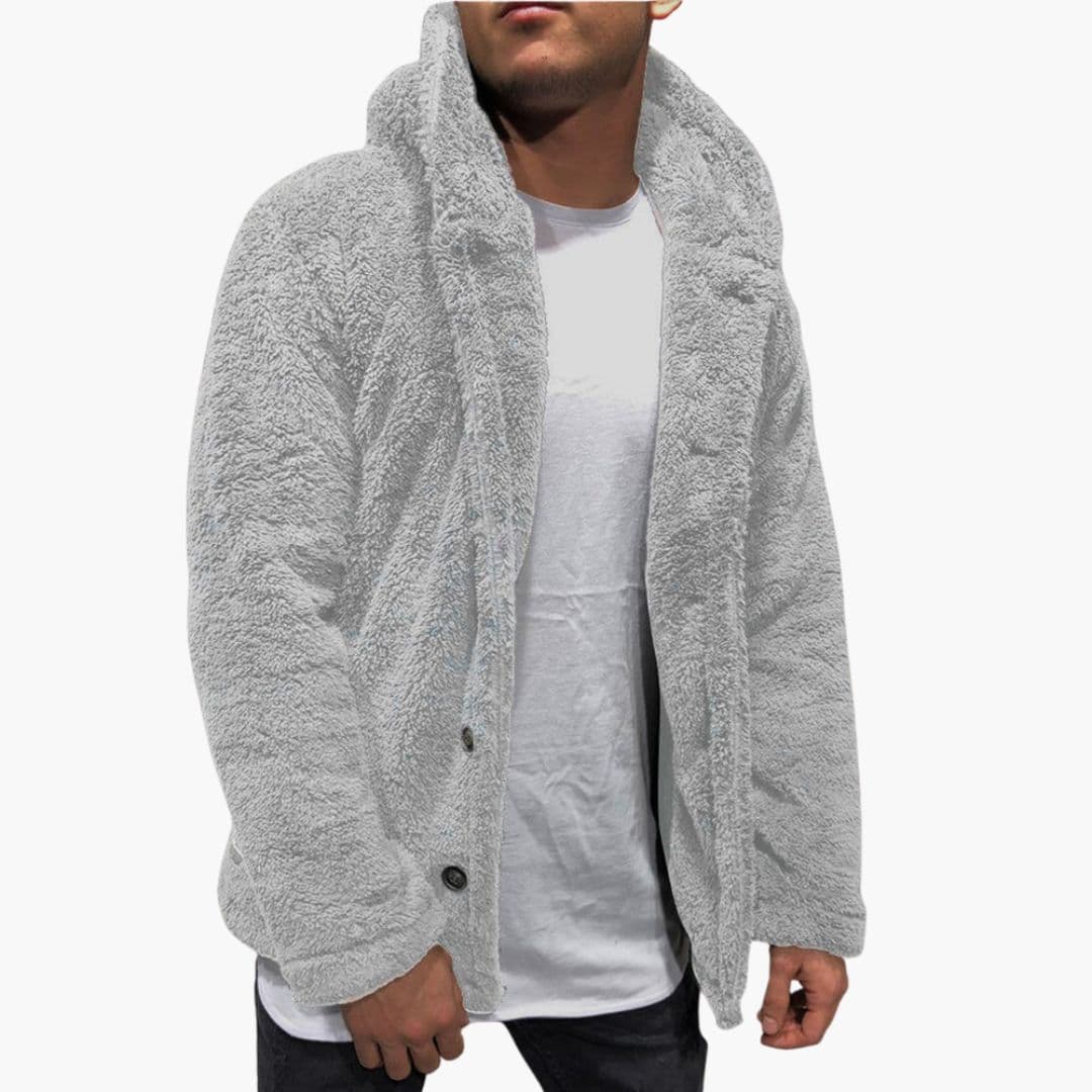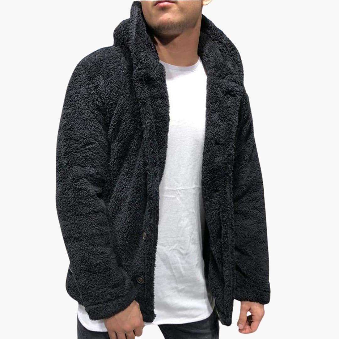 This men's hooded jacket is designed with a structured hood and a front button closure. It includes two side pockets integrated into the seams. The long sleeves end with straight hems, and the lower hem has a simple finish. The textured fleece outer surface covers the entire jacket and highlights a look suitable for cold seasons.