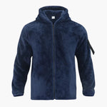 This men's hoodie jacket features a stand-up collar with a full zipper closure. Two side pockets and a zippered pocket on the sleeve offer practical storage. The long sleeves end with elastic cuffs and the straight hem ensures a neat finish. The textured fleece surface completes its style.