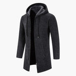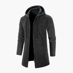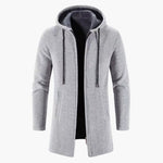 This men's hooded jacket features an adjustable drawstring, a full-length zipper, and two vertical side pockets. It has long sleeves with straight cuffs and a straight hem. Its textured surface and inner lining provide support and structure.