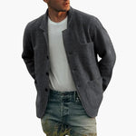 This men's jacket features a straight cut with a button closure on the front and a simple collar. The model includes long sleeves and several front pockets offering practical storage. The plain woven surface maintains a structured appearance, suitable for everyday wear during transitional seasons.