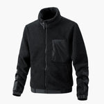This men's autumn jacket is designed with a stand-up collar and a full zip closure. It features a zipped chest pocket, two integrated side pockets, and long sleeves with reinforced elbow areas. The hem and cuffs have elasticated finishes to maintain the fit. The textured fleece exterior covers the entire jacket and highlights a look suited for the transitional season.