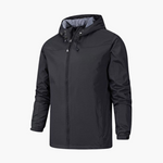 Men's rain jacket with adjustable hood, zipper, and side pockets.
