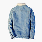 This men's denim jacket features an outer surface made of denim and an inner sherpa lining, suitable for cooler seasons. Equipped with a button closure on the front and a contrasting sherpa fold-down collar, it combines a classic design with practical features. The jacket has two flap chest pockets with buttons and two side pockets. Available in black and light blue, it can be worn layered over a t-shirt, sweater, or shirt, perfect for outings, weekends, or everyday use.