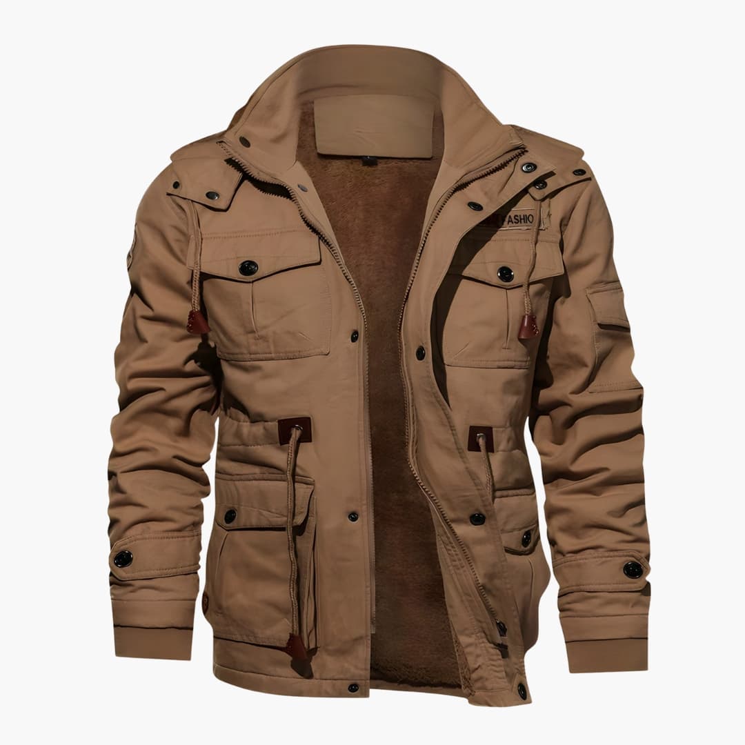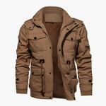 Men's hooded jacket with fleece lining and multiple pockets on the front.