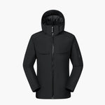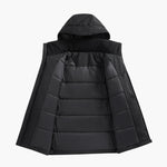This men's jacket features an attached hood, a full-length front zipper, and long sleeves. Two chest pockets at the front and a pocket on the sleeve provide storage space. The straight hem and clean outer look give a neat style. The interior is quilted with horizontally stitched sections.