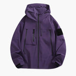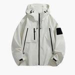 This men's jacket includes a hood with an adjustable drawstring, long sleeves, and a full-length front zipper. Several zippered pockets are placed on the chest and sides for storage. The cuffs are adjustable with hook-and-loop straps. The loose fit allows layering of different garments for various styles or uses.