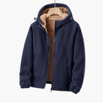 Men's zip-up hooded jacket with sherpa lining and pockets.