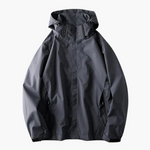 Men's hooded jacket with zipper closure and side pockets.