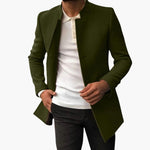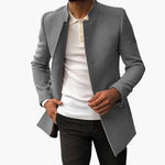 Modern men's jacket with a sleek collar and structured cut.