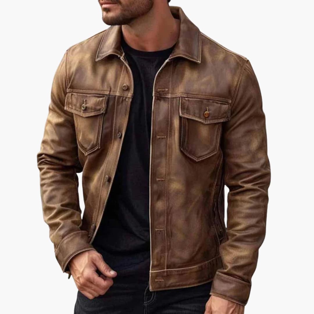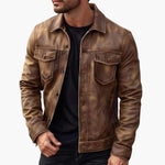 This men's jacket features a structured shirt collar with full button closure, two chest flap pockets with buttons, and two vertical side pockets. It has long sleeves with buttoned cuffs and a straight hem. The plain outer material and straight cut enhance the overall fit.