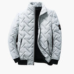 Men's quilted zip-up jacket with stand-up collar and ribbed hem.