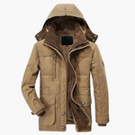 This men's jacket features a stand-up collar with zipper and snap button closure. It includes several front pockets and long sleeves equipped with adjustable straps at the wrists. Its removable hood covers the head as needed, while the straight hem and textured surface complete a structured cut design.