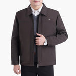 This men's jacket features a pointed collar followed by a hidden zipper closure at the front. Two vertical slit pockets are placed on the sides. The long sleeves end with simple hems, while the jacket finishes with a straight hem. The outer surface remains smooth and structured.