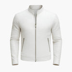 This men's jacket features a short stand-up collar and a full-length zipper. It includes two vertical zippered front pockets. The long sleeves and straight hem maintain a fitted cut. Its embossed textured surface highlights a structured and clean look.