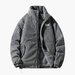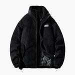 This men's jacket features a stand-up collar with a full-length zipper closure. The straight cut maintains a regular line across the torso. The long sleeves end with elastic cuffs. The bottom hem is straight and slightly adjustable. The outer surface displays a vertical ribbed texture with light inner padding for better shape retention.