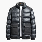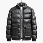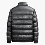 This men's jacket features a stand-up collar, a full-length front zipper, a quilted surface with horizontal topstitching, two large flap pockets on the front, and long sleeves with ribbed cuffs. The interior is lined. Straight hem and contrasting details for a structured look.