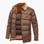 This men's jacket features a quilted surface, a straight cut, and a front zipper closure. The collar is adorned with a faux fur finish. The lining and cuffs are padded. The sleeves and back display a regular quilted pattern. Two side pockets are placed at the waist.