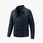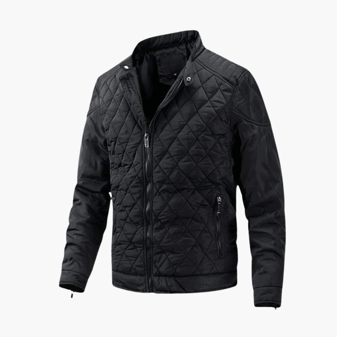 Men's quilted zip-up jacket with stand-up collar and structured details.