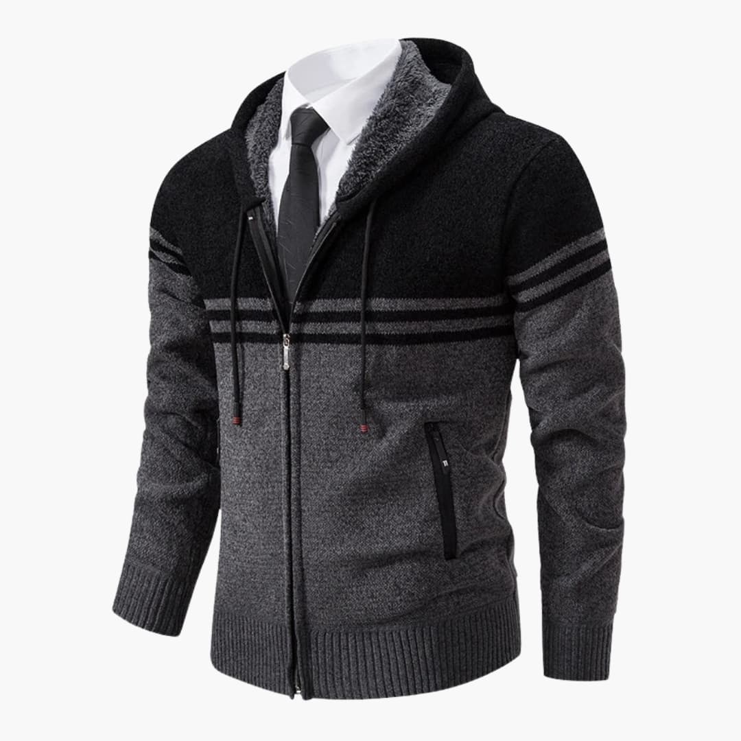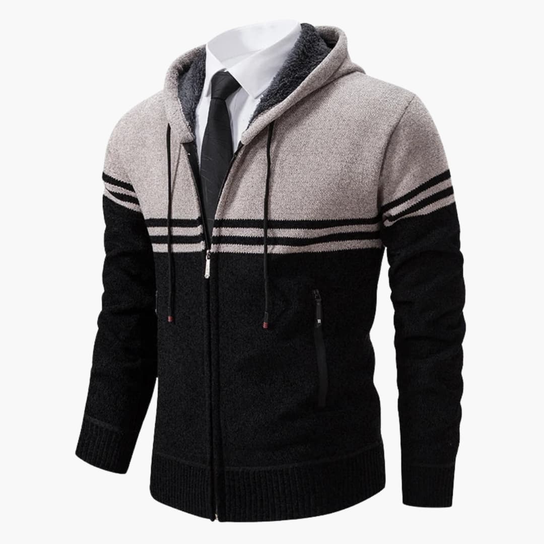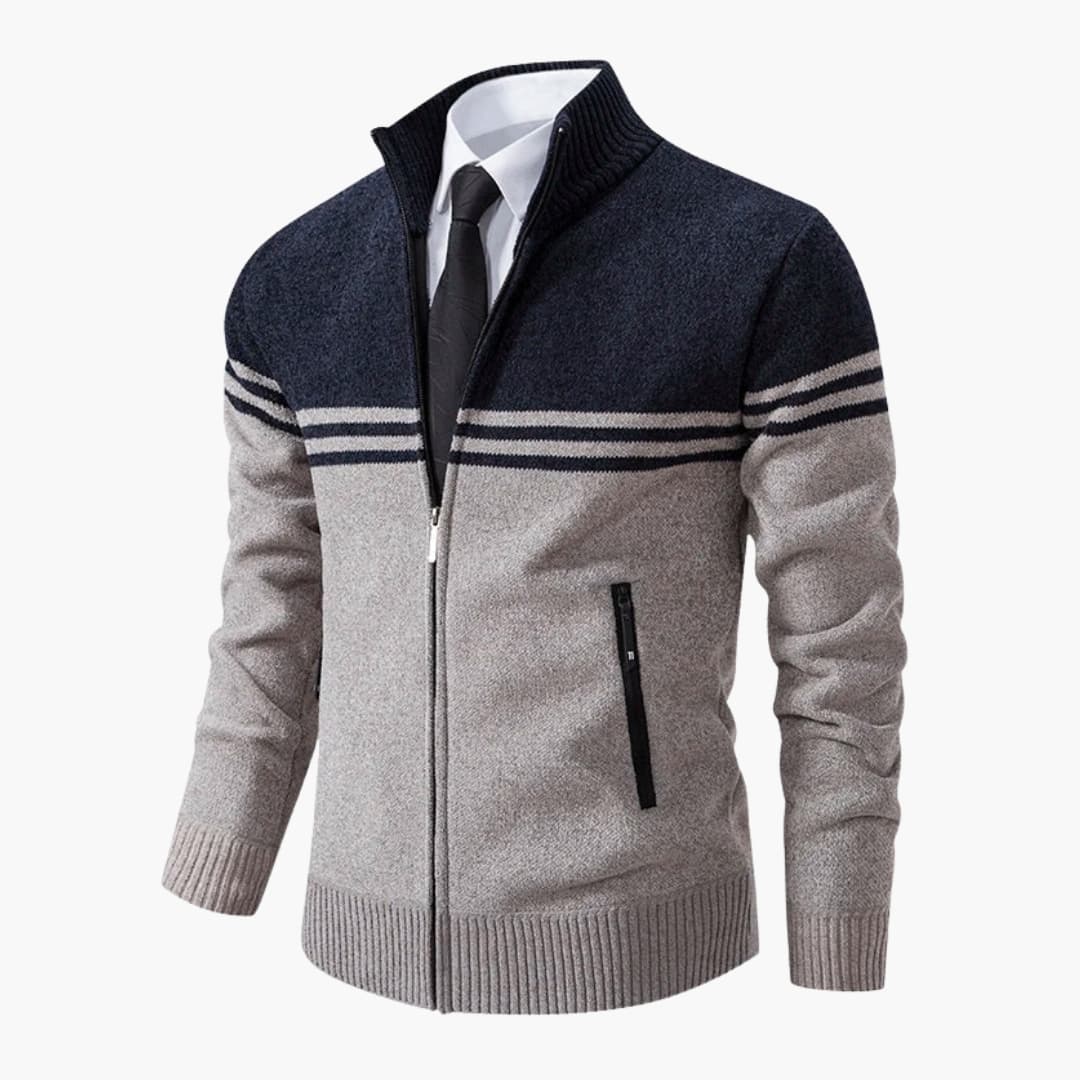 This men's jacket features a ribbed stand-up collar followed by a full front zipper closure. Two vertical zippered pockets are placed at the front. The long sleeves end with ribbed cuffs, while the hem is reinforced with a ribbed border. The surface displays a solid textured pattern with contrasting horizontal stripes.