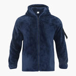 Men's fleece jacket with hood, zip closure, and long sleeves