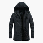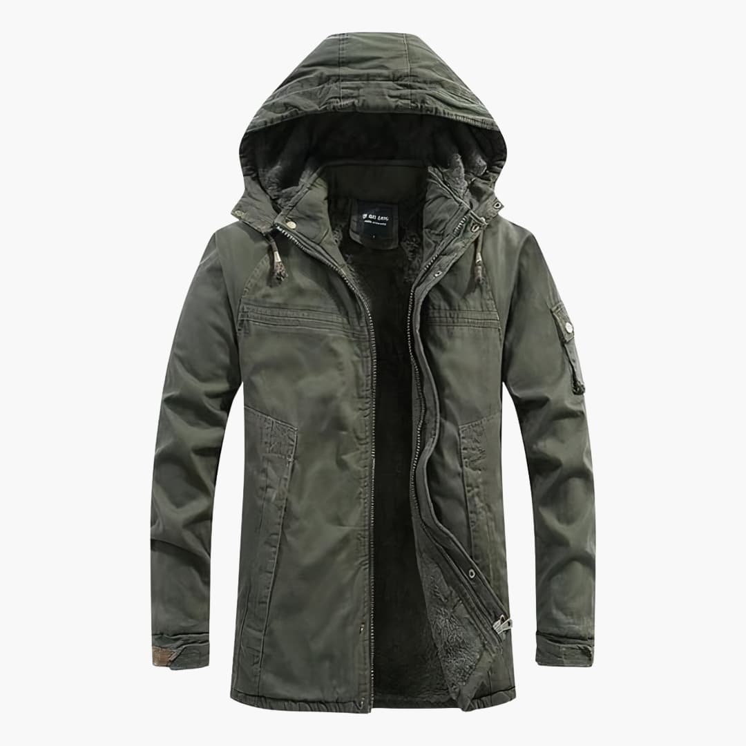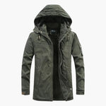 This men's jacket features a hood with adjustable drawstrings and a front zipper closure. It includes several pockets positioned on the sides as well as a sleeve pocket for practical storage. The long sleeves end with topstitched hems, and the interior is lined with a textured surface covering the entire jacket. The straight hem completes the piece with a neat finish.