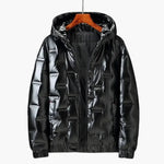 This men's puffer jacket is designed with an integrated hood, a full-length front zipper, and two side pockets. The long sleeves end with elastic cuffs, while the straight hem includes an elastic edge.