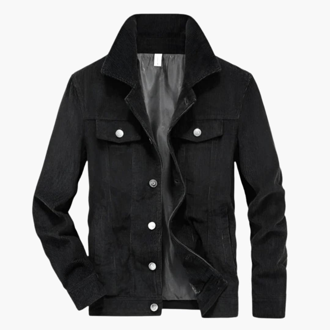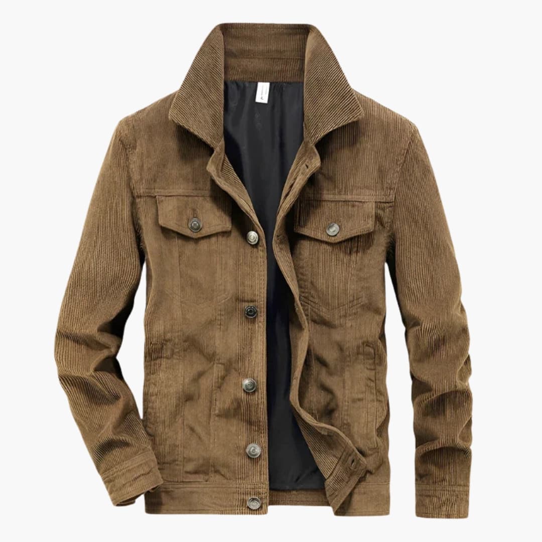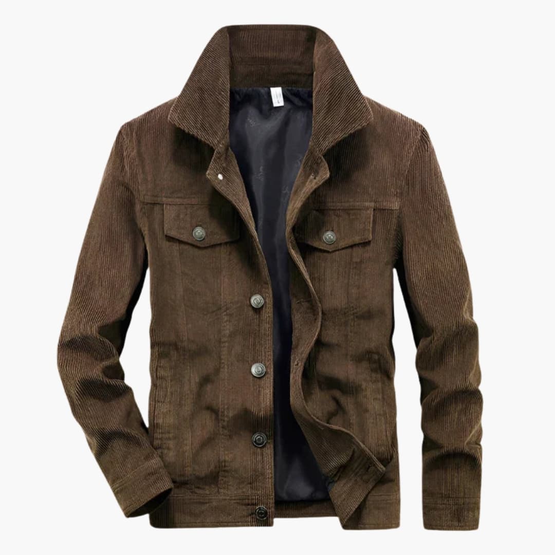 Men's corduroy jacket with button closure and button-flap chest pockets.