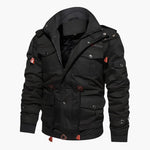 This men's tactical jacket features an adjustable hood, a front zipper closure with buttons, and long sleeves. Several flap pockets are arranged at the front to provide storage space. The straight hem adds extra length. The interior has a visible lining, while the solid exterior look gives a structured appearance.