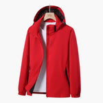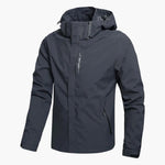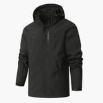 This unisex jacket has a hood, a full-length front zipper, and long sleeves with adjustable cuffs. It includes two zipped side pockets and a stand-up collar. The straight hem offers a neat finish. All elements are visible on the front and back of the product.