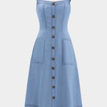 Embrace casual chic with the Willow Blue Denim Midi Dress. This effortlessly stylish design features a button-down front with functional pockets and a flattering A-line silhouette. The adjustable shoulder straps and vintage-inspired wooden buttons add a touch of timeless charm to this modern piece.